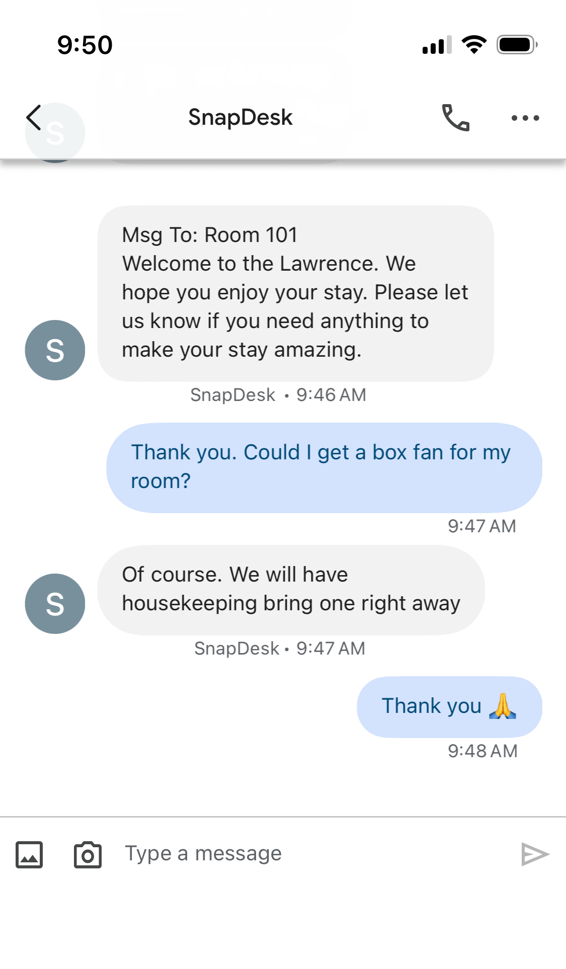 Today’s guests find in-room phones outdated and inconvenient and would rather use their own smartphone to interact with hotel staff. SnapDesk makes this effortless—guests can request services via their device without downloading apps.