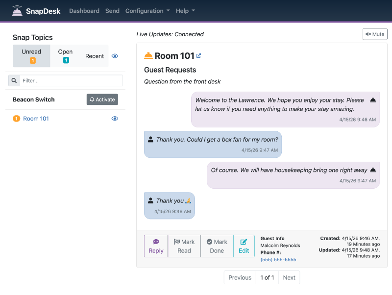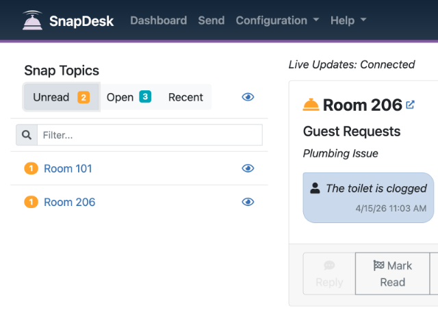 With SnapDesk, no staff member needs to be immediately available. Guests don’t have to wait on hold just to ask for an additional pillow or fresh towels. Guest needs are routed directly to the right staff member without interruptions or hold times.